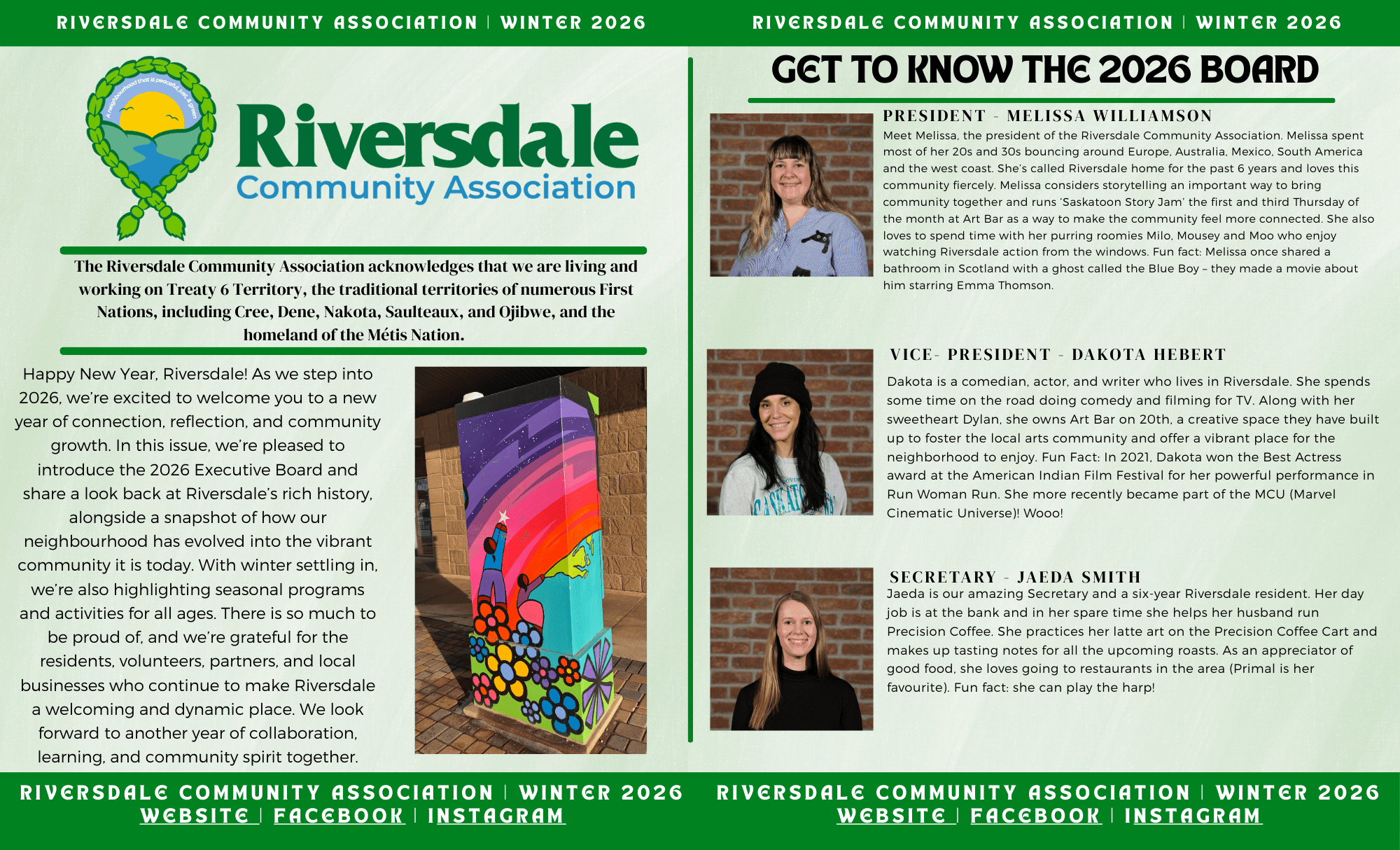 The Riversdale Community Association will host the 2022 Annual General Meeting Tuesday October 25th, 2022 from 6:30pm to 8:30pm in the library at King George Community School (721 Avenue K South). This is a family friend event and will have free doughnuts, coffee, and juice. We are looking for people to fill the positions of Vice-President, Indoor Coordinator, Civics, and Member-at-Large. Join a dynamic board with funding for the city to run all kinds of great programs in the neighbourhood. Have your say, provide awesome programs, and give back to your community.
